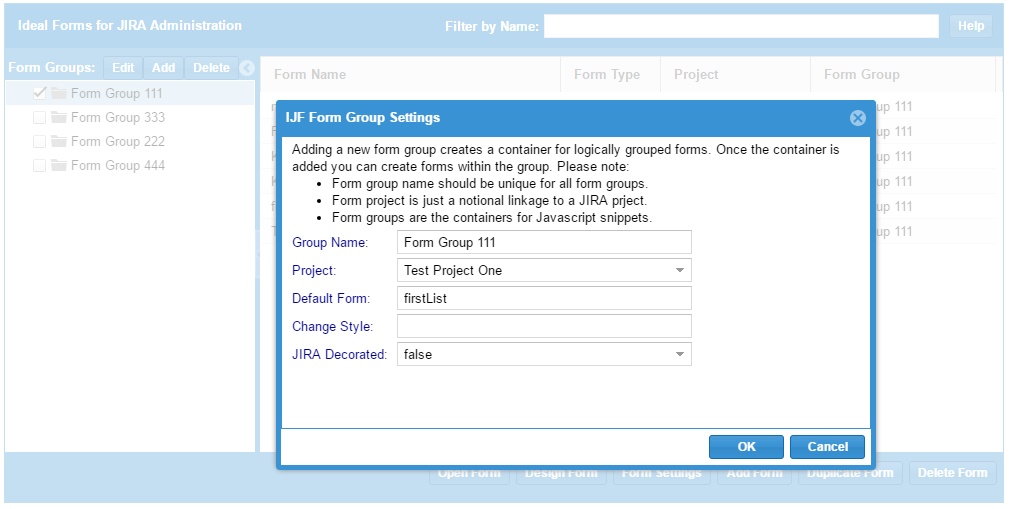 From the main Ideal Forms for Jira Administration screen click the "Add" button to Add a Form Group or click the "Edit" button if you want to edit.