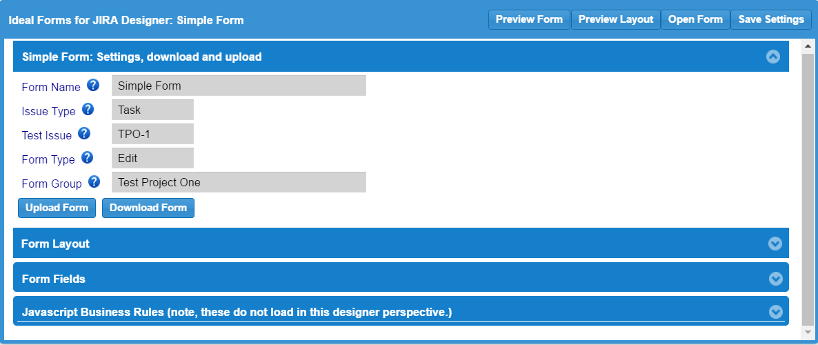 Upload Form: Will open a form file from your computer and load into this browser window. Uploading does not save to the Jira instance.